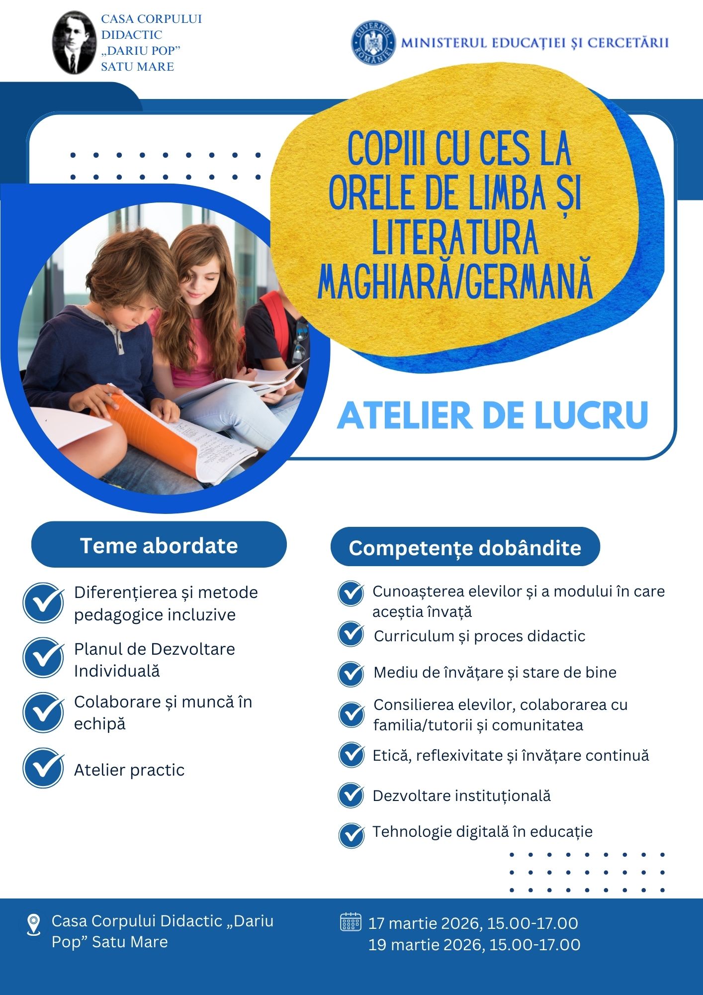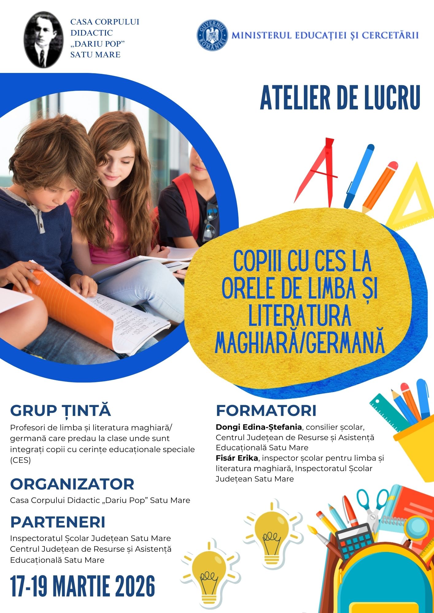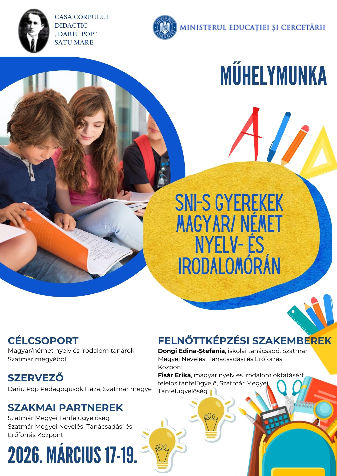 În perioada 17-19 martie 2026, s-a desfășurat workshopul cu tema „SNI-s gyerekek a magyar/német nyelv- és irodalomórán” („Copiii cu CES la orele de limba și literatura maghiară/germană”), adresat profesorilor de limba și literatura maghiară/germană.